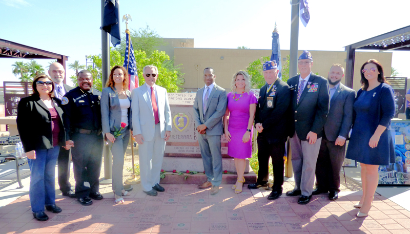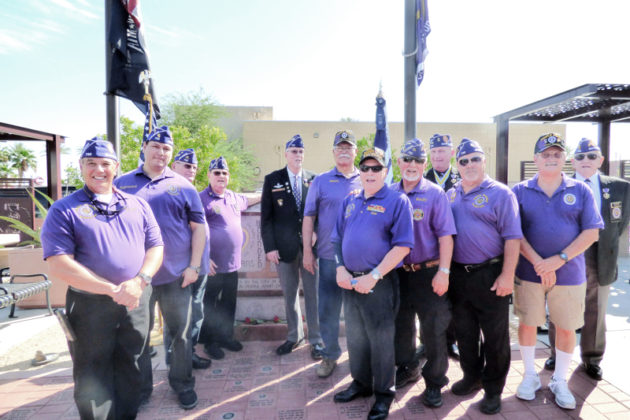 Six roses were placed in front of the Purple Heart monument in honor of the Army, Marine Corp, Navy, Air Force, Coast Guard and the Merchant Marines. “They represent our unity, fellowship and respect to all our fallen comrades and citizens.”