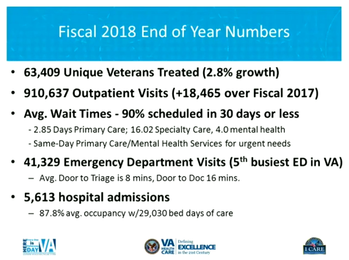 “So, I’ve got just a small little presentation to go over with you here. So, I just wanted to review what has happened over the last fiscal year. This year we treated 63,000 veterans that’s about a 2.8 percent increase over the year, right now our growth since the start of the fiscal year were at right about four and a half percent so we’ll continue to grow here and I don’t know how many of you know this, but down the road from here on 215 they’re going to be building about 8,000 houses over the next ten years and so that’s going to mean even more veterans moving in so this facility is going to continue to grow.”